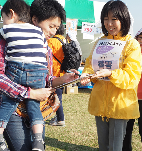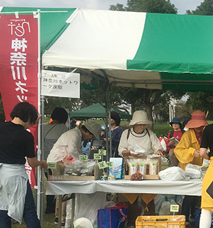 神奈川ネットも参加、毎年好評の南三陸さんさん商店街「千葉のり店」、仙台の「鈴木有機農園」のお米・味噌などたくさんの東北の美味しい物産を販売しました。