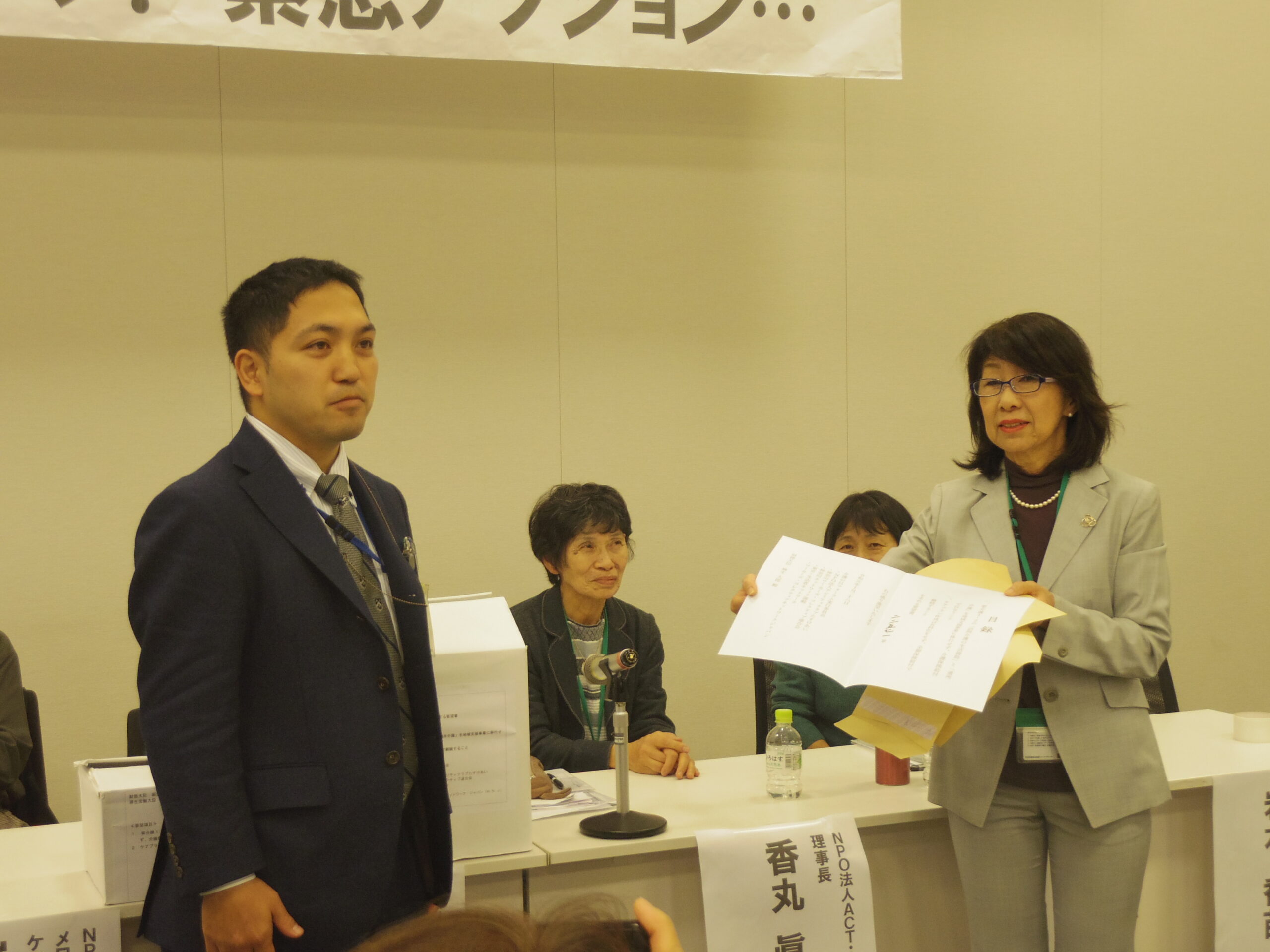 10月28日、衆議院第一議員会館の大会議室で「介護保険制度の崩壊ストップ!緊急アクション」集会をNPO法人アビリティクラブ他2団体と共催しました。要介護1・2の利用者と介護者家族の当事者の声、小規模ディサービス事業者の現場の声を紹介し、介護保険の次期改定が給付抑制と利用者負担増にならないよう求める要望書を厚生労働省・財務省の担当者に手渡しました。