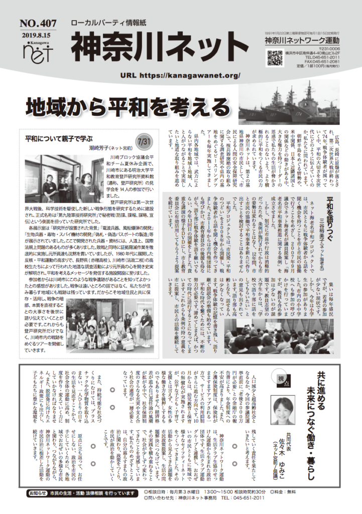 1面 ■地域から平和を考える 平和を語りつぐ 三谷裕美子(ネット海老名) 平和について親子で学ぶ 潮崎芳子(ネット宮前) ■視点 共に進める 未来につなぐ働き・暮らし 共同代表 佐々木 ゆみこ(ネット宮前/県議) 2面 ■...