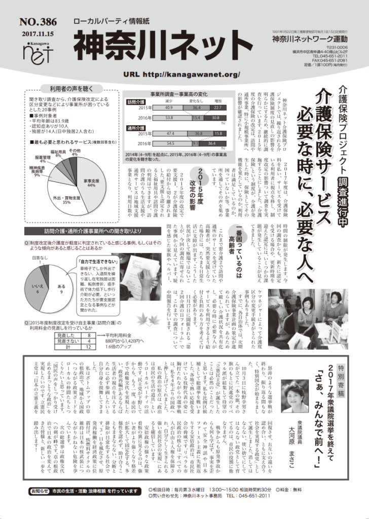 参議院選挙が終わり、国の社会保障審議会・介護保険部会では、次期制度改定の議論が急ピッチで進んでいます。 神奈川ネット介護保険プロジェクトは、緊急アクションチームを立ち上げ、保険給付から「要介護1・2の生活援助と福祉用具他を外さないことを求め... -