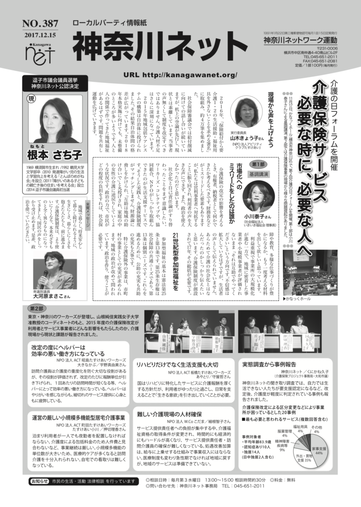 1面 ■介護保険、いざという時使えない!? 加藤よう子(神奈川ネット介護保険アクションチーム事務局/座間市議) 厚生労働省に署名提出 「要介護1・2を外さない」 渡辺あつ子(ネット宮前/川崎市議) 「33自治体緊急公開質問」回答より抜粋 県内自治体... -