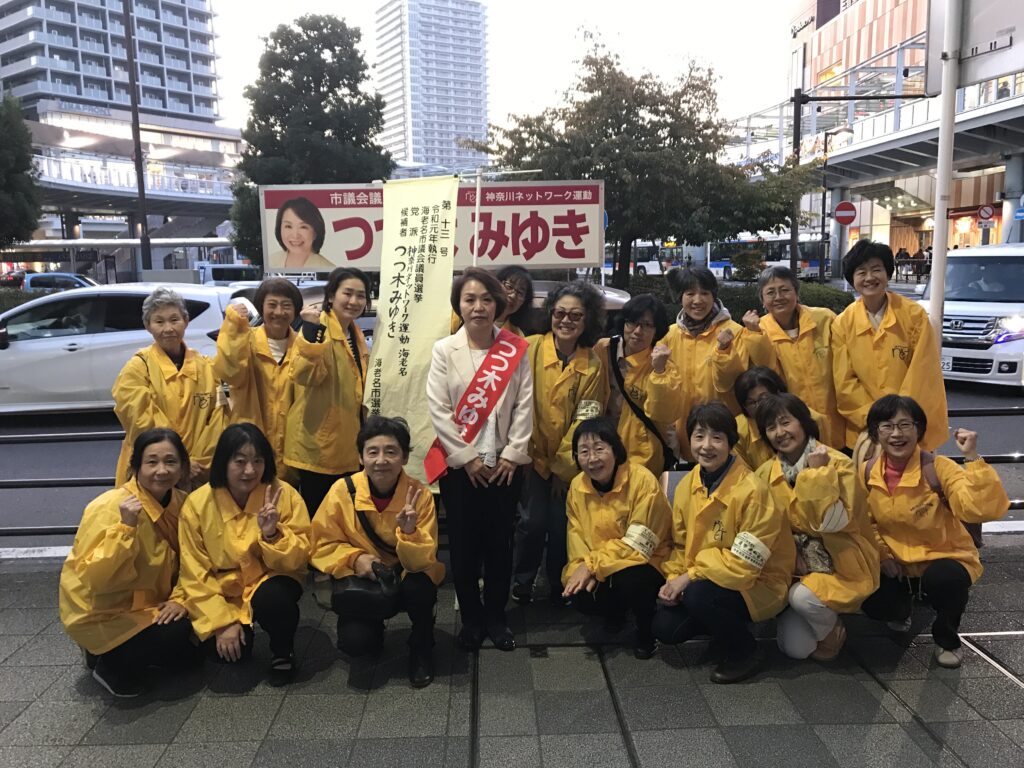 海老名の市議選最終日、駅前ペディストリアンデッキをスタートにドコモショップ前、ビナウォーク前と街宣活動しました。 神奈川ネットからも黄色いジャンパーを着たメンバーが沢山集まり応援しました。