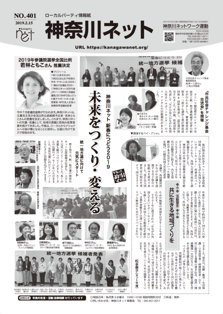 1面 ■神奈川ネット 新春につどう2019 未来をつくり・ 変える 「市民社会チャレンジ基金交流会」を開催 統一地方選に向けて元気にスタート 《活動報告》共に生きる地域づくりを 松本泰子(ネット平塚) ■2019年参議院選挙全国比例 若... -