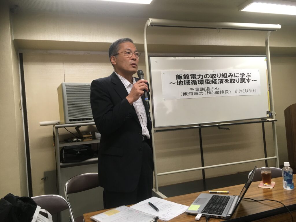 8月4日、飯館電力(株)取締役千葉訓道さんを講師に迎えた学習会(持続可能な環境をつくる政策・制度研究会主催)で、エネルギーの自治と地域づくりを学びました。 大電力会社に独占された電力システムから地域分散型へ、さらにそこから地域の雇用を生み出し... -