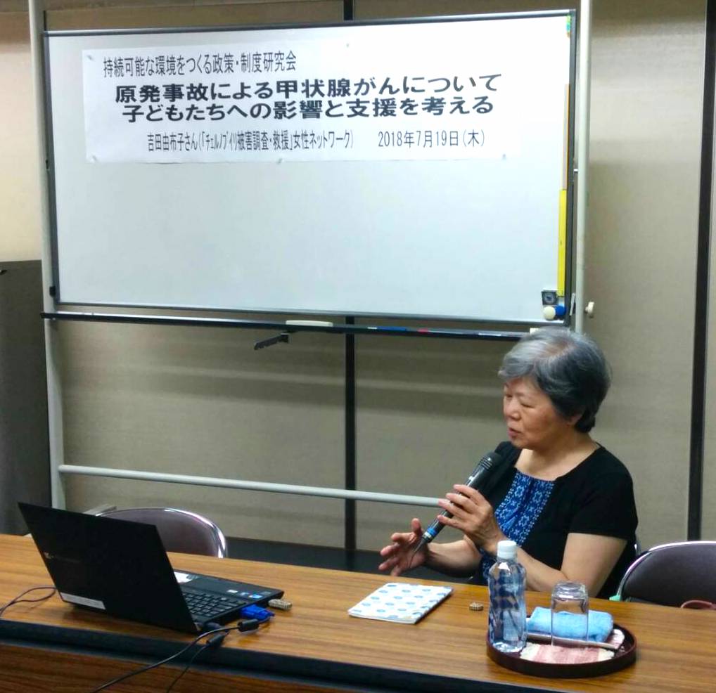 7月19日、持続可能な環境をつくる政策・制度研究会による「福島原発事故後の子どもの甲状腺がんについて」NPO法人⒊11甲状腺がん子ども基金専務理事吉田由布子さんを講師に学習会が開催されました。 福島第一原発事故から7年が過ぎた今、その影響について... -