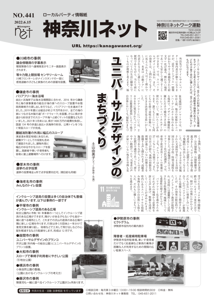 1面 ■再ユニバーサルデザインのまちづくり 土山由美子(ネット伊勢原/市議) 伊勢原市の事例 ●ピクトグラム ●障害者・妊産婦用駐車場 川崎市の事例 ●議会傍聴席の字幕表示 ●等々力陸上競技場センサリールーム 鎌倉市の事...
