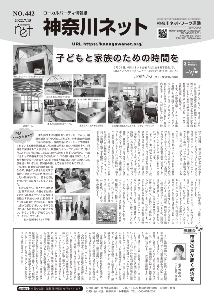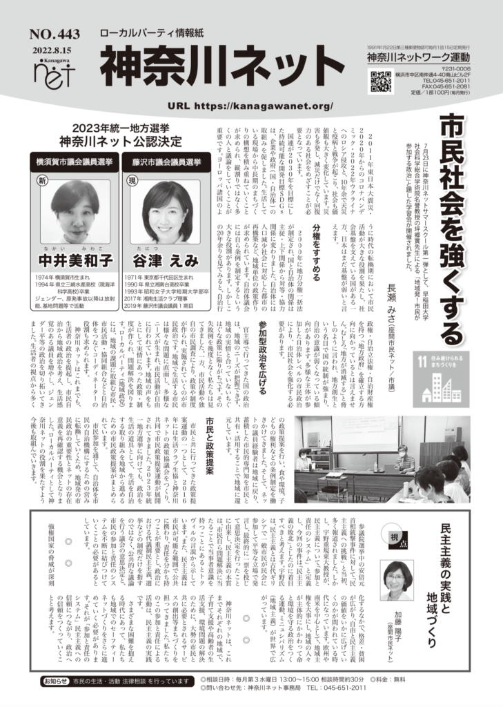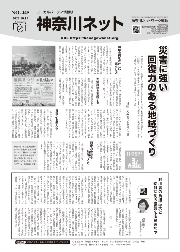 1面 ■災害に強い回復力のある地域づくり 谷津えみ(ネット藤沢/市議) ■視点 利用者の負担拡大と給付抑制の議論を市民参加で 加藤 陽子(座間市民ネット) ・・・・・・・・・・・・・・・・・・・・・・・・・・・・・ 2面 ■【横須... -