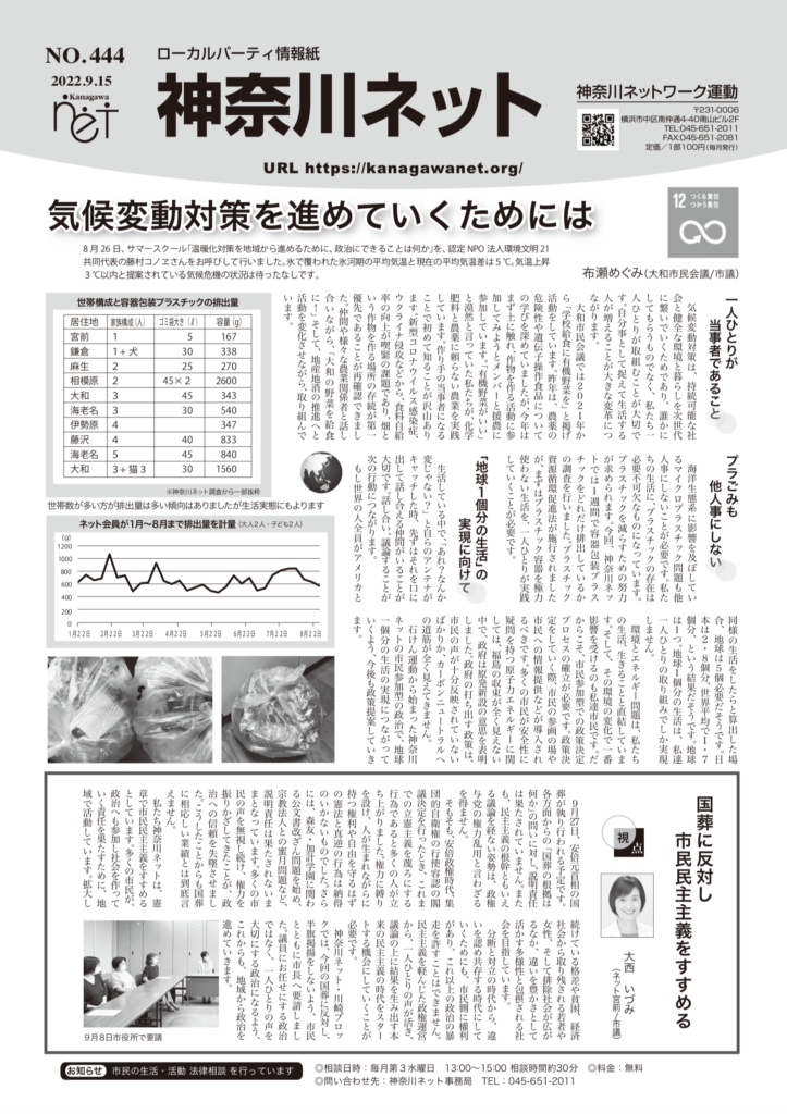 1面 ■気候変動対策を進めていくためには 布瀬めぐみ(大和市民会議/市議) ■視点 国葬に反対し市民民主主義をすすめる 大西いづみ(ネット宮前/市議) ・・・・・・・・・・・・・・・・・・・・・・・・・・・・ 2面 ■【鎌倉地域の... -