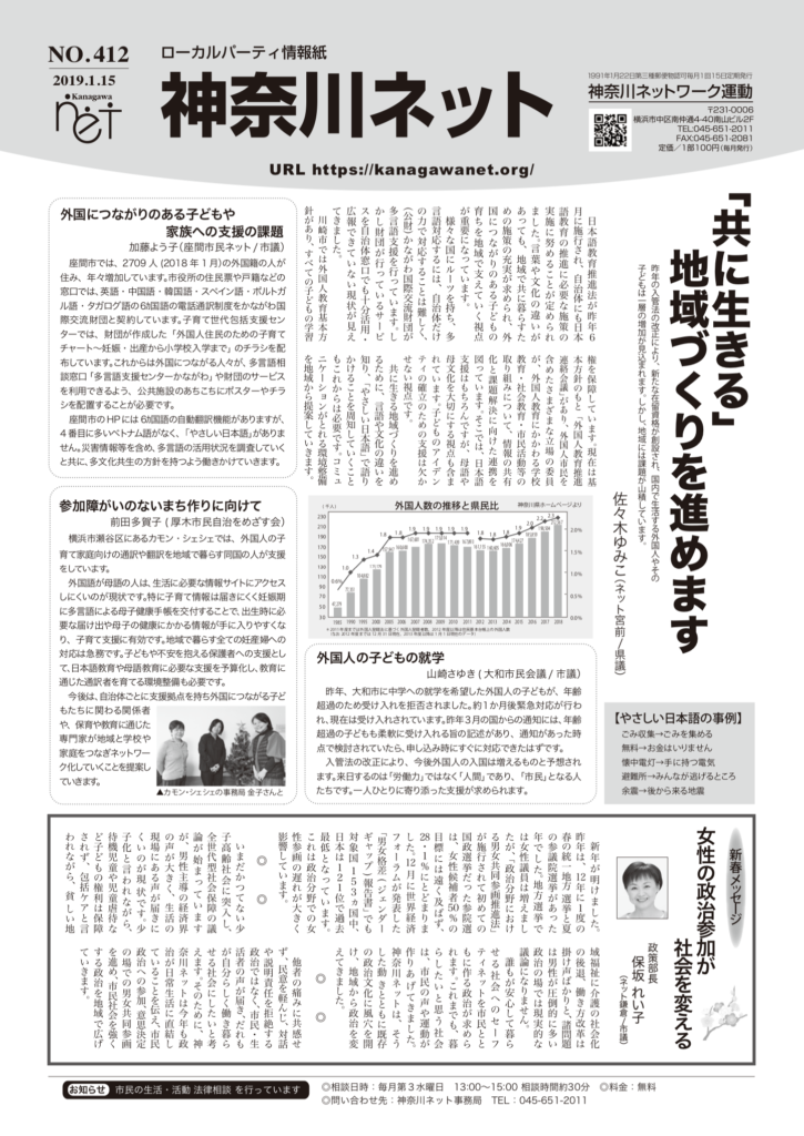 1面 ■「共に生きる」地域づくりを進めます 佐々木ゆみこ(ネット宮前/県議) 《グラフ:外国人数の推移と県民比》 外国につながりのある子どもや家族への支援の課題 加藤よう子(座間市民ネット/市議) 参加障が... -