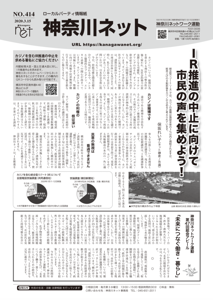 1面 ■IR推進の中止に向けて市民の声を集めよう! 保坂れい子(ネット鎌倉/市議) カジノは賭博です カジノの利権の根は深い 民意の無視は看過できません 《表:カジノを含む統合型リゾート(IR)について 全国電話世論... -