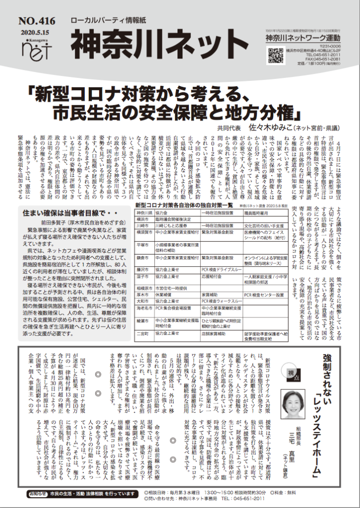 1面 ▪️新型コロナ対策から考える、市民生活の安全保障と地方分権 共同代表 佐々木ゆみこ(ネット宮前/県議) 表:新型コロナ対策各自治体の独自対策一覧 住まい確保は当事者目線で・・ 前田多賀子(厚木市民自治を... -