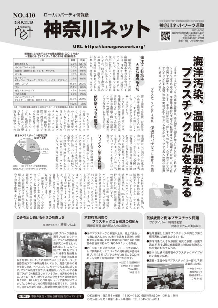 1面 ■海洋汚染、温暖化問題からプラスチックごみを考える 保坂れい子(ネット鎌倉/市議) 海洋プラ対策は大きな視点も大切 使い捨てプラの削減も リサイクル手法の問題 《事例》ごみを出し続ける生活の見直しを 高津Weネット 萩... -