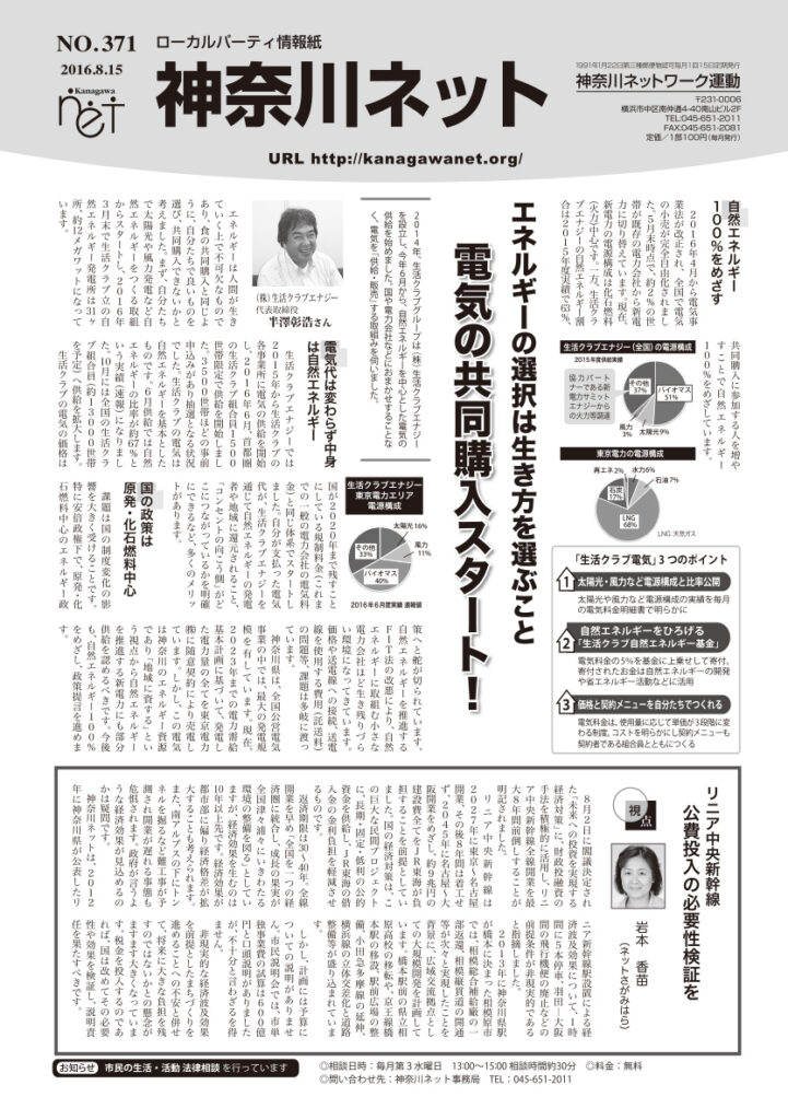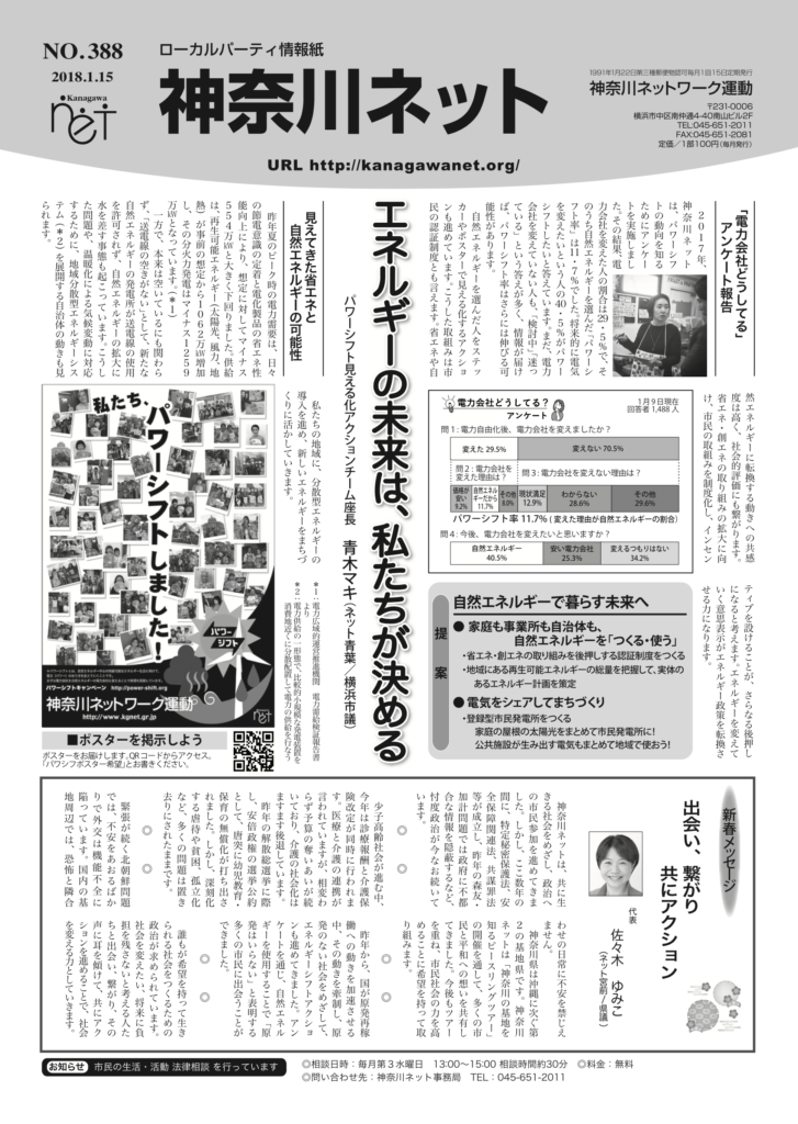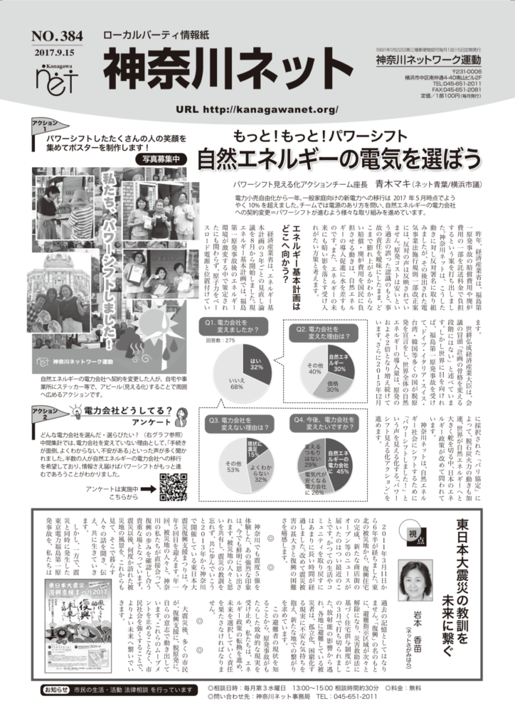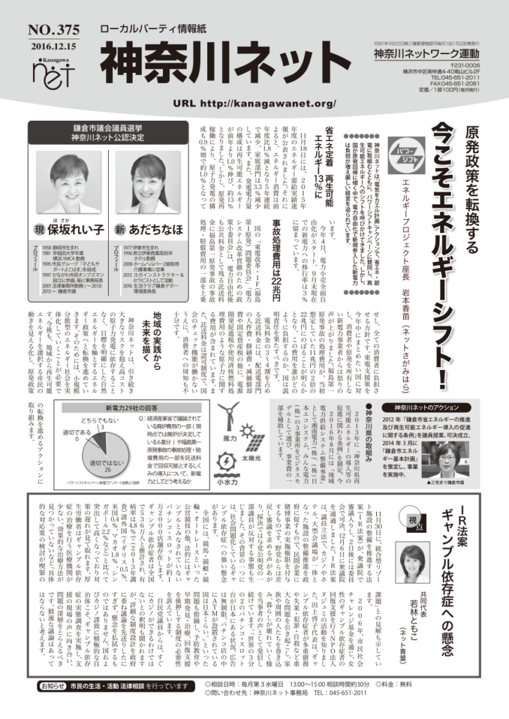 1面 ■原発政策を転換する 今こそエネルギーシフト! エネルギープロジェクト座長 岩本香苗(ネットさがみはら) 省エネ定着 再生可能 エネルギー13%に 事故処理費用は22兆円 地域の実践から未来を描く 神奈川ネットのアクショ... -