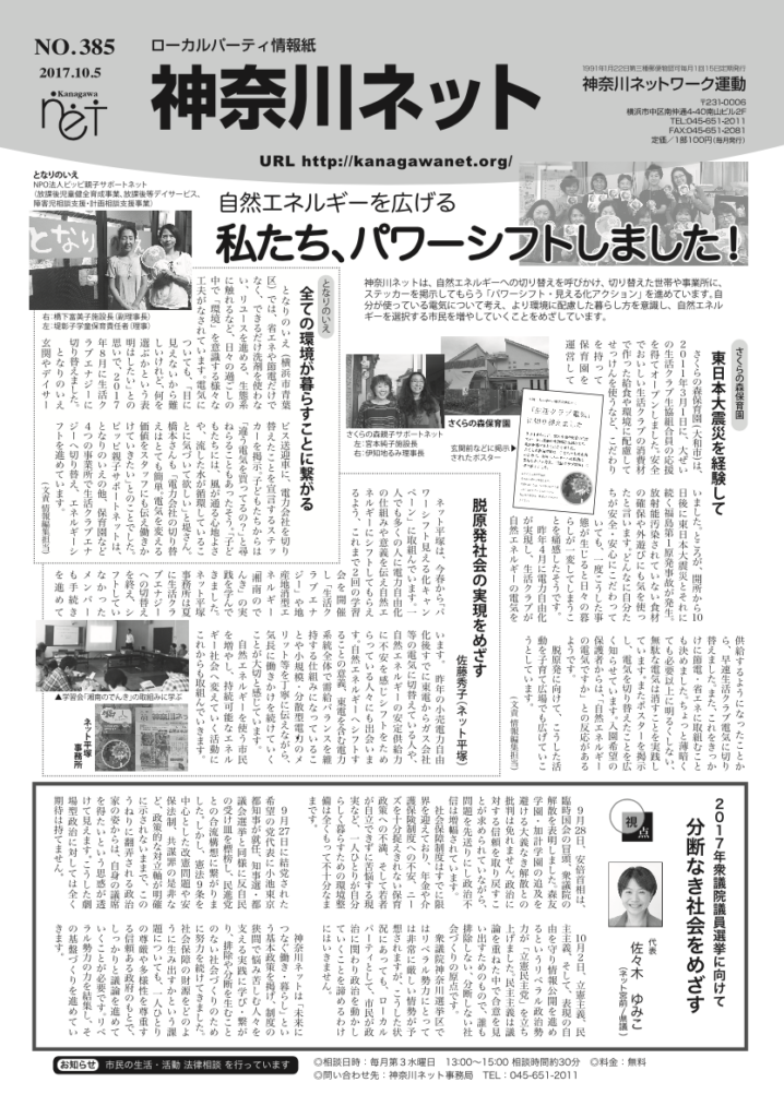 1面 ■自然エネルギーを広げる 私たち、パワーシフトしました! さくらの森保育園 東日本大震災を経験して となりのいえ 全ての環境が暮らすことに繋がる 脱原発社会の実現をめざす 佐藤秀子(ネット平塚) ■視点 2017年衆議院議員選... -
